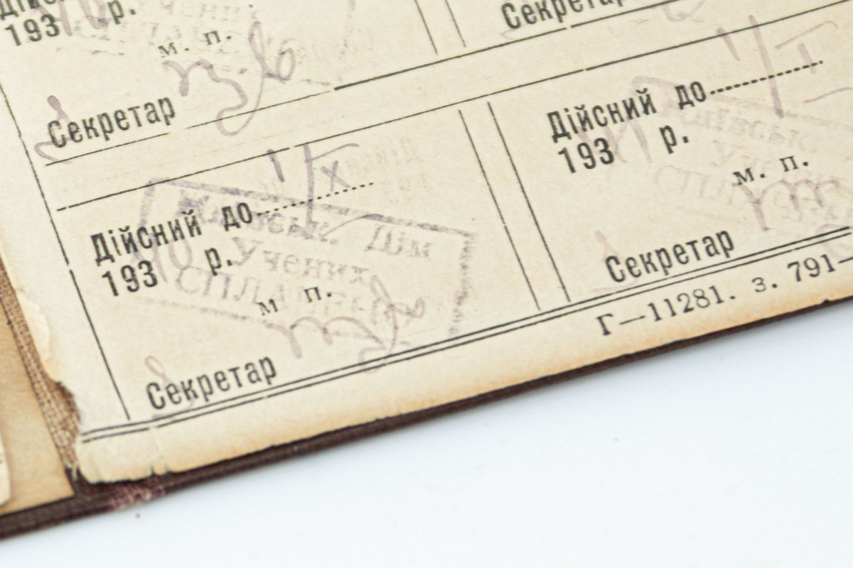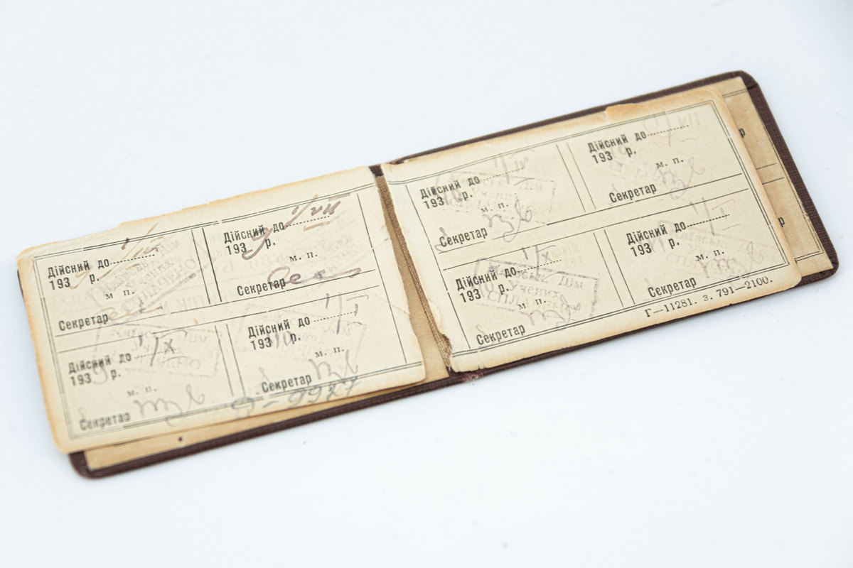 У вигляді книжечки, обкладинка тверда, коричневого кольору із тисненням на лицьовій стороні. На першому розвороті місце для фотокартки та персональних даних дійсного члена. На інших розворотах – місце під штампи про продовження дії квитка, які заповнені за 1939–1941 рр. Сторінки відірвані.