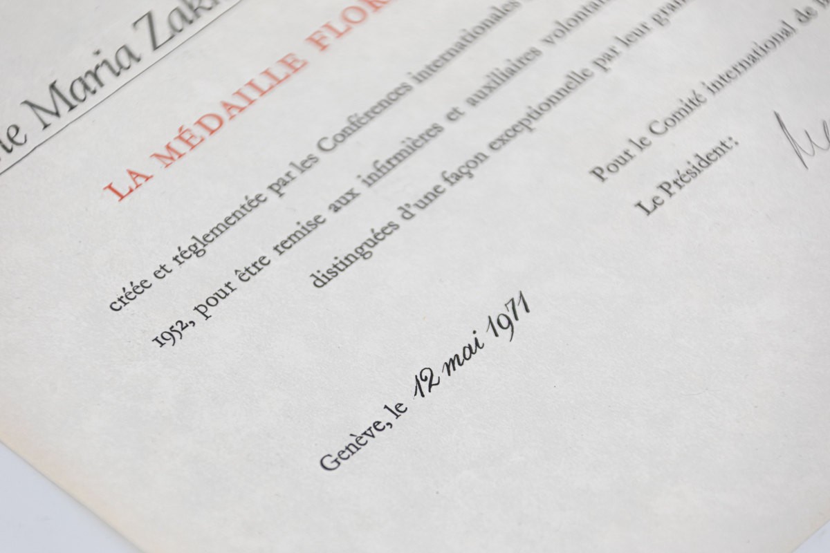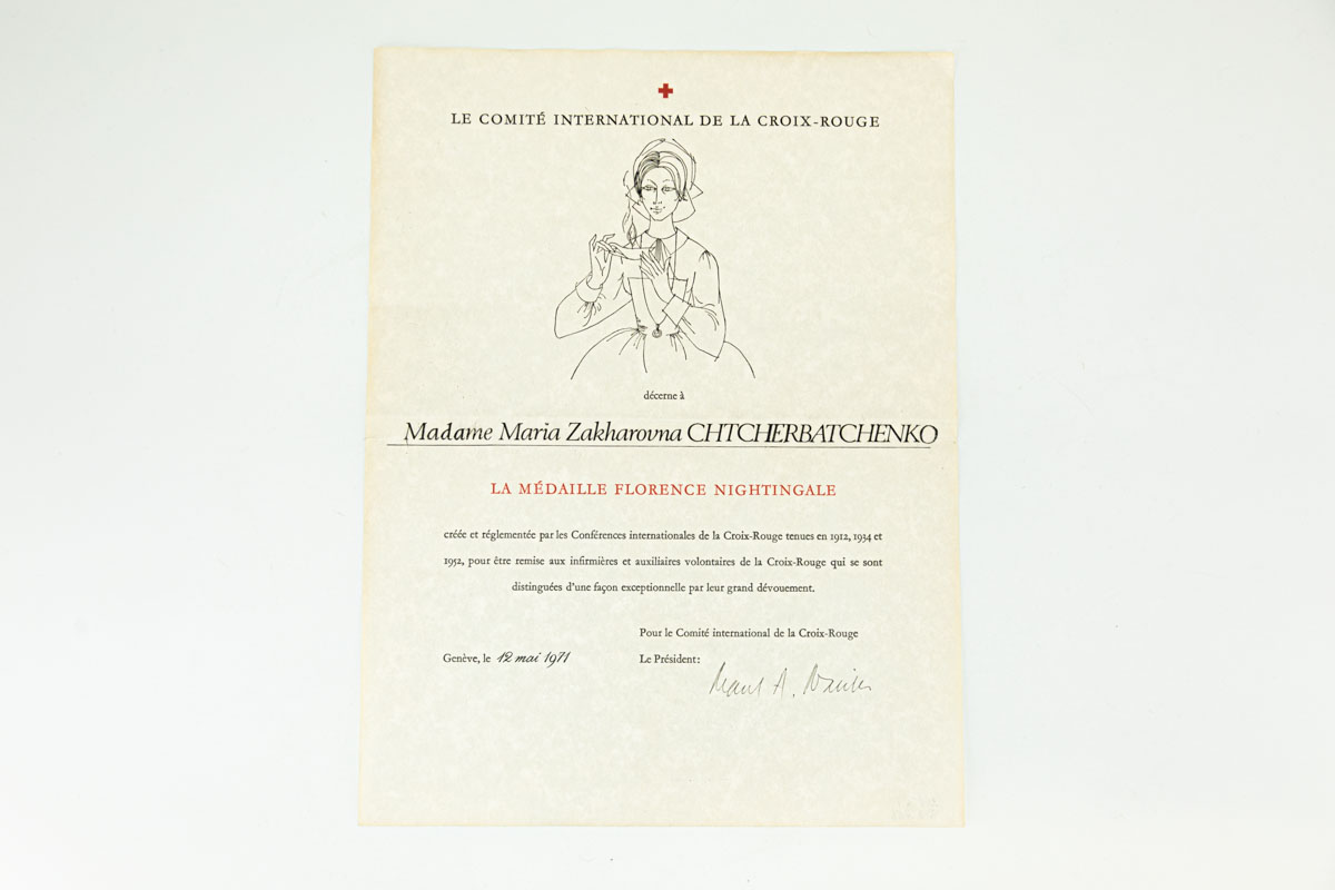Марія Захарівна Щербаченко нагороджена медаллю імені Флоренс Найтінгейл 12 травня 1971 р. за милосердя, героїзм і звитягу, проявлені нею під час порятунку тяжкопоранених на полі бою. Медаль імені Флоренс Найтінгейл – це жіноча нагорода, заснована Міжнародним комітетом Червоного Хреста в 1912 р., призначена волонтерам-медсестрам та допоміжному персоналу Червоного Хреста. Нагороду присуджують у день народження Флоренс Найтінгейл – 12 травня, раз на два роки. На медалі зображена Флоренс Найтінгейл зі світильником у руці – визнаним символом милосердя.
