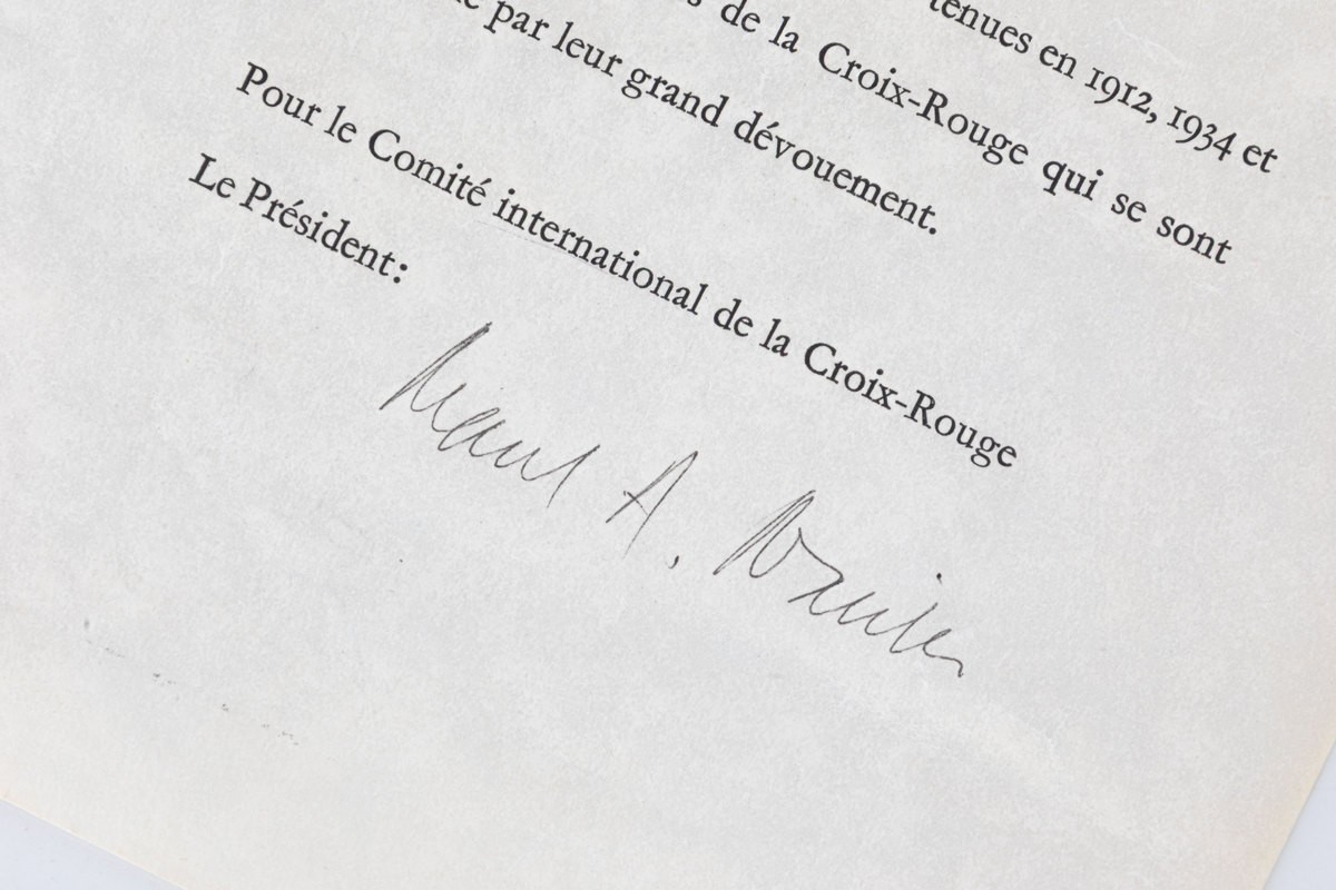 На прямокутному аркуші паперу, однобічний друкарський текст чорного та червоного кольорів. Зверху по центру – червоний хрест та назва організації. Нижче – зображення Флоренс Найтінгейл зі світильником у руках. Під зображенням – текст із зазначенням прізвища нагородженої та назви нагороди, закінчується датою та підписом Президента Міжнародного комітету Червоного Хреста.