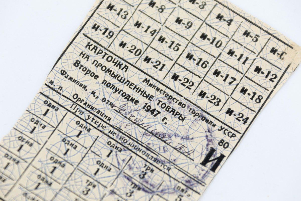 Картка на промислові товари – персональний документ карткової системи, виданий Міністерством торгівлі УРСР. Такі картки регулювали забезпечення населення промисловими товарами в умовах гострого післявоєнного дефіциту та надавали доступ до одягу, взуття, білизни й господарських речей. Кожен відривний купон означав не абстрактну цифру, а конкретну, життєво необхідну річ – пару взуття, відріз тканини, пальто чи теплий светр. На відміну від продовольчих, картки на промислові товари використовували значно рідше, проте мали не меншу цінність. Отримання одягу або взуття часто ставало подією, до якої готувалися заздалегідь: збирали купони, вистоювали черги, чекали надходження товару. Картки ретельно зберігали, інколи носили разом із документами, адже їх утрата означала неможливість законно придбати необхідні речі. В УРСР картки на промислові товари з’явилися на завершальному етапі дії карткової системи – безпосередньо перед її скасуванням у грудні 1947 р. в межах грошової реформи СРСР. Саме тому такі документи стали короткочасним, але промовистим явищем повоєнної економіки, що зафіксувало перехід від воєнного нормування до формально «вільної» торгівлі.