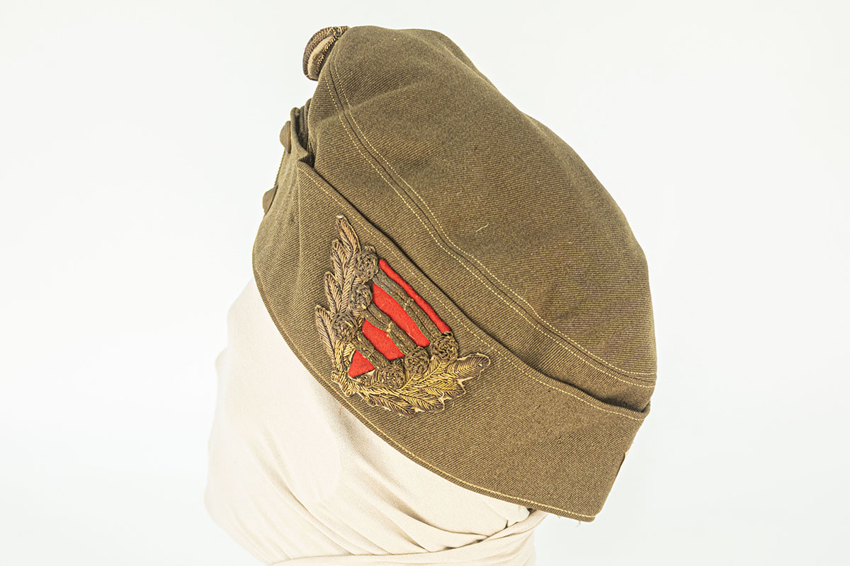 Із шерстяної тканини зеленого кольору, на зеленій підкладці, край підшитий жовтою шкірою. Спереду два металевих ґудзики, вище – нашивка із золотистого позумента та шнурка, кокарда. На пілотці з лівого боку добре видно трикутну нашивку з червоного сукна з трьома горизонтальними шнурами, обрамлену вишитими лавровими гілками. Червона нашивка у вигляді трикутника є символом командного складу, три шнурові перемички – знак офіцерського або старшинського рангу, а лаврові гілки – традиційний символ військової честі та належності до елітного складу армії. Двох абсолютно ідентичних пілоток майже не існувало, так як вишивку часто виконували вручну або напівручним способом, через що емблеми незначно відрізнялися між собою. Звичним явищем того часу були індивідуальні замовлення офіцерів.