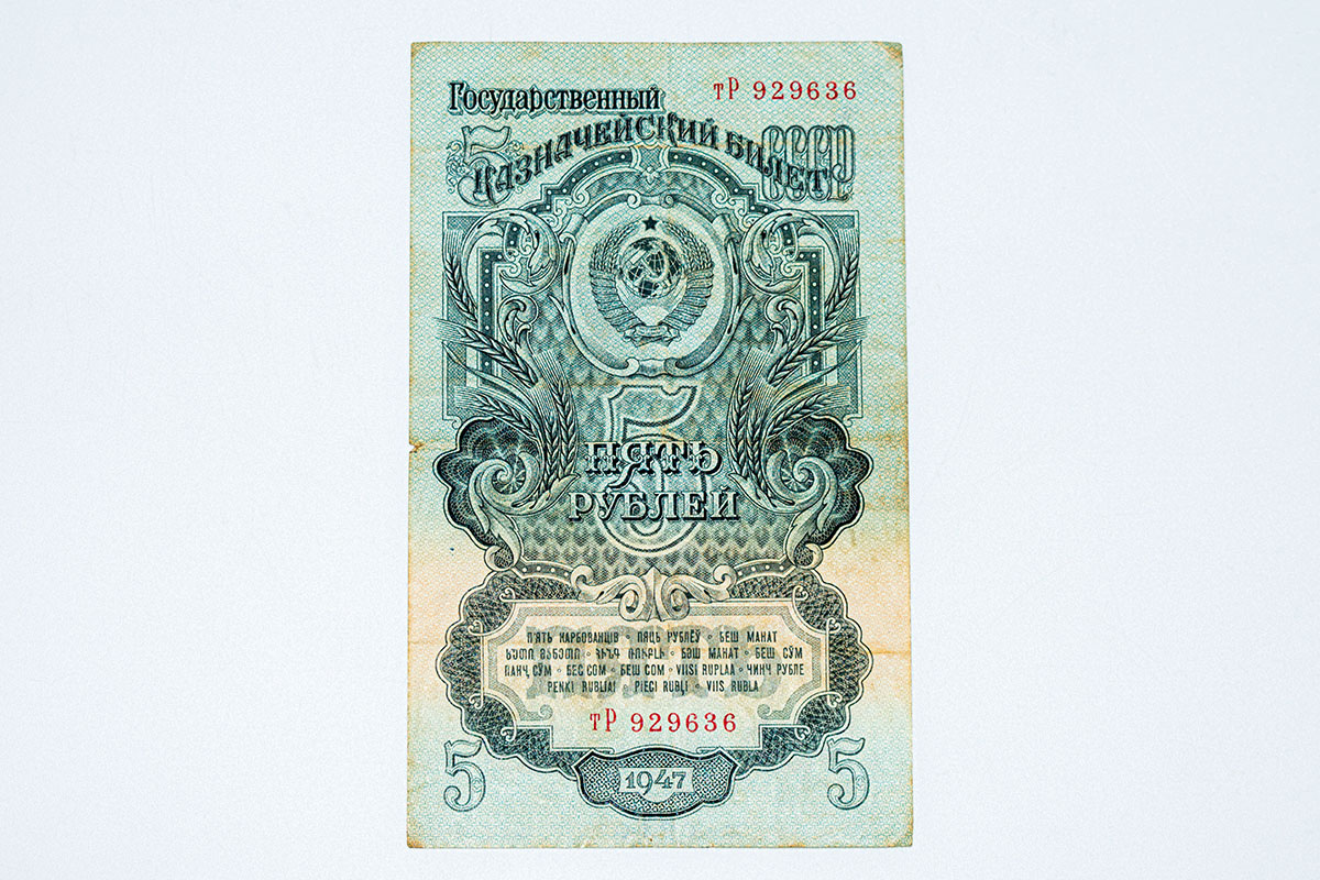 The 5-ruble State Treasury Note of the USSR, issued in 1947, is rectangular in shape, vertically oriented, and printed on watermarked paper. The color scheme is predominantly blue and orange, with the addition of black, blue, light green, and brown-gray tones. The obverse features a decorative rosette with the 1946 version of the State Emblem of the USSR in the center. Above it is an inscription in Russian: “Государственный казначейский билет СССР” (State Treasury Note of the USSR). The denomination is indicated numerically and in words in Russian, Ukrainian, Belarusian, Azerbaijani, Georgian, Armenian, Turkmen, Uzbek, Tajik, Kazakh, Kyrgyz, Karelian, Moldovan, Lithuanian, Latvian, and Estonian. A six-digit serial number with a two-letter prefix (e.g., тР 929636) and the issue year, 1947, are printed at the top and bottom.