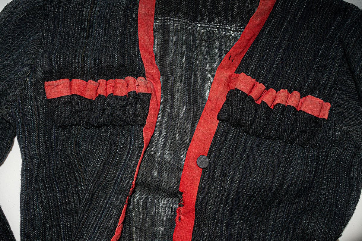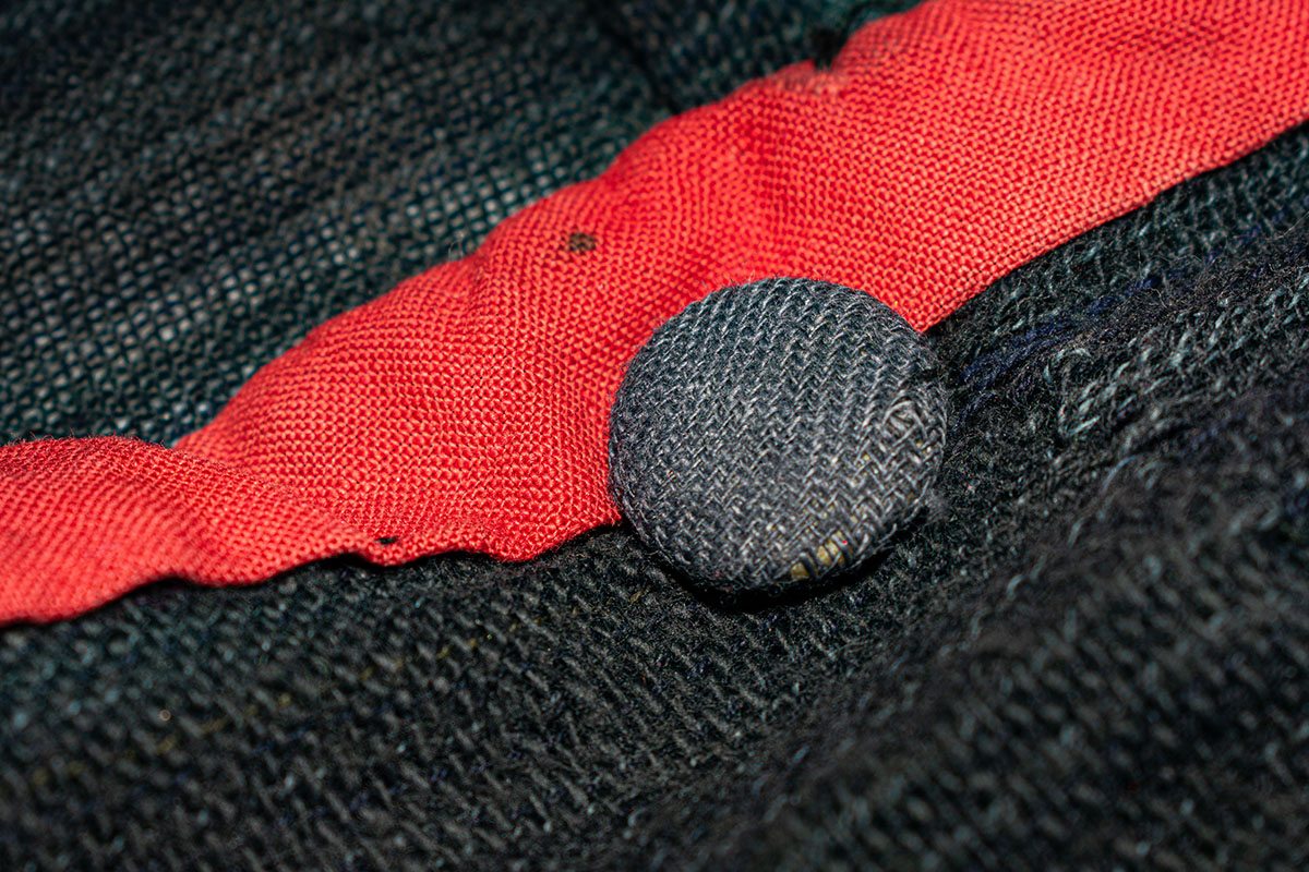 he costume is made in the style of a chokha—a traditional outer garment worn by men in the Caucasus region. It is sewn from gauze dyed black. The garment is slightly fitted at the waist and flares at the bottom, with long sleeves and no collar. On the upper chest area, red fabric gazyrs are sewn on both sides, each designed to hold eight cartridges. All edges of the costume are trimmed with red fabric. It fastens with two black fabric-covered plastic buttons.