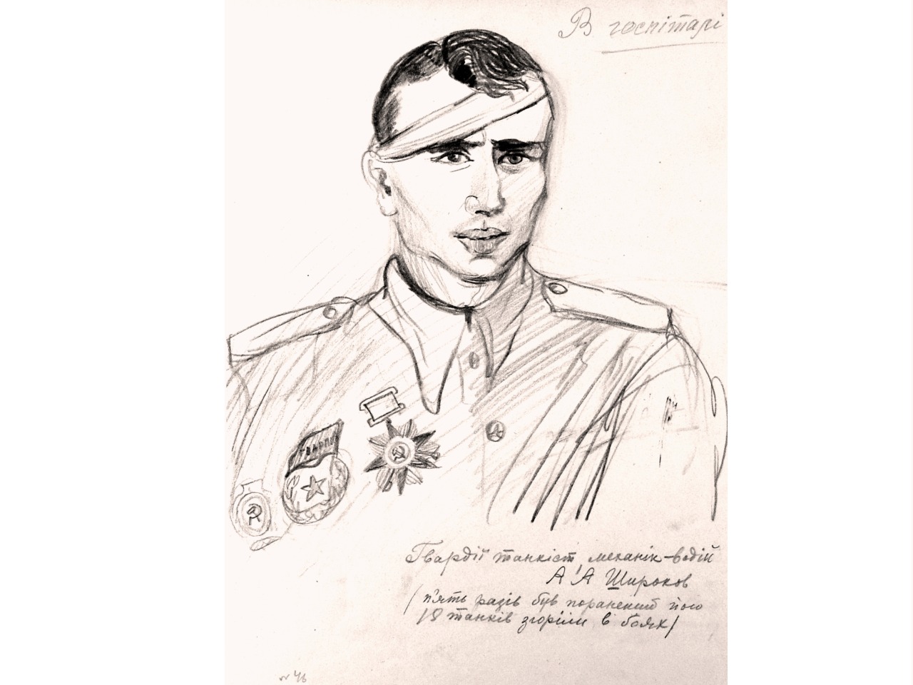Although the team had been instructed on which figures to document, Yenina sketched everything she encountered along the way – ruined Ukrainian villages, displaced people left without homes, a girl named Mariyka from the village of Lopatynn (now Lopatyn urban-type settlement, Lviv region), who greeted tank crews and gifted them an embroidered kerchief, captured German soldiers, and more. She also created a series of drawings in a military hospital. These included portraits of Hero of the Soviet Union A. Sulyma, Order of Glory 3rd Class recipient I. Antonov, and other Red Army soldiers from the 1st Tank Army. Some works contain no commentary, while others feature detailed captions. On the portrait of a tank driver-mechanic, for example, she wrote: “Guardsman tanker A.A. Shyrokov. Wounded five times, 18 of his tanks burned in battles.”