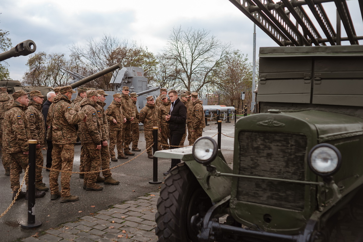 Museum guides Alla Hrushetska, Ihor Buchma, Ruslan Bolobon, and Oleh Prelovskyi introduced the cadets to exhibitions on the Second World War and the current russian–Ukrainian war, as well as to displays of military equipment and weaponry. This year, particular interest was sparked by new exhibits – naval drones of the “Magura” and “Sea Baby families”. The cadets were able to explore the evolution of military technologies from the first half of the 20th century to the present day. To deepen their historical knowledge, a copy of the museum publication “Ukraine in the Second World War. The War Calendar” was presented; this year it received the approval mark of the Ukrainian Institute of Education Development under the Ministry of Education and Science of Ukraine: “Approved for Use in the Educational Process.”