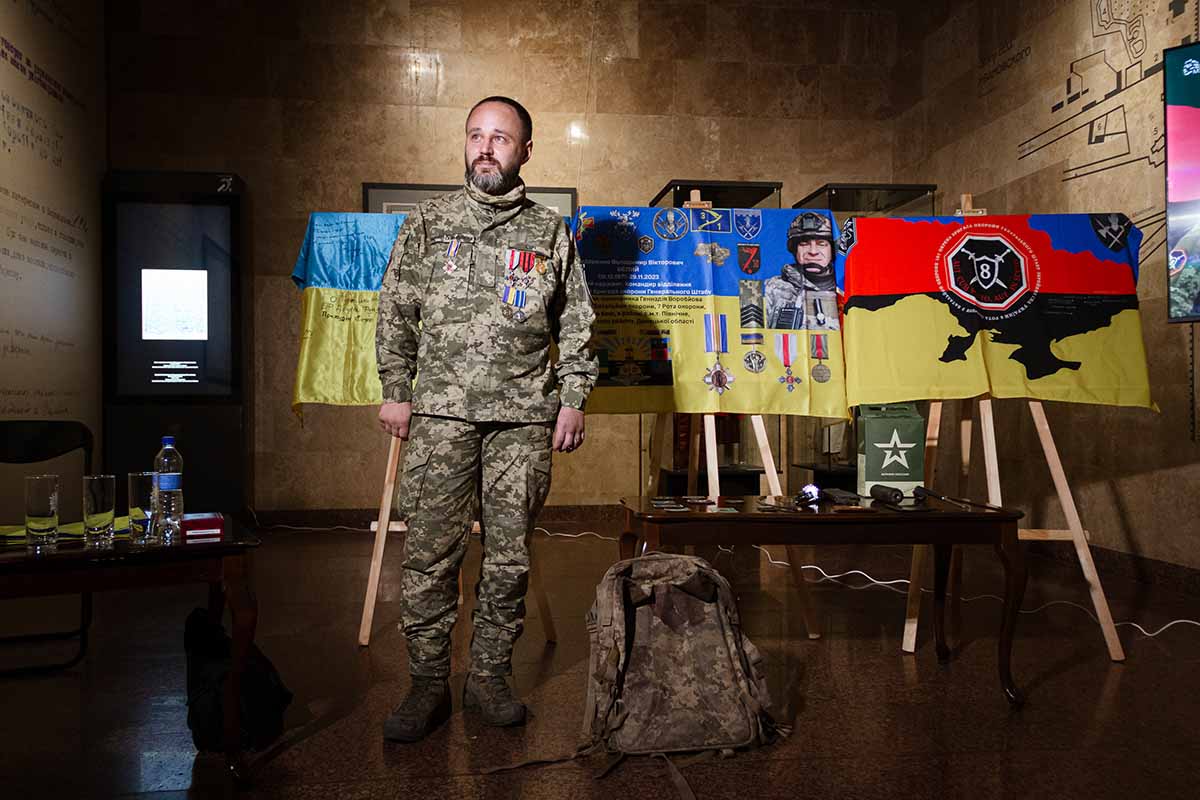 During the event, the defender solemnly transferred to the Museum’s collection wartime artifacts – blood-soaked personal belongings, shoulder insignia, and brigade flags, as well as trophies captured from the enemy. The story of one flag especially moved the audience. On the blue-and-yellow cloth was depicted Ihor’s friend and mentor – squad commander of the 101st Guard Brigade of General Staff, Senior Sergeant Volodymyr Bondarenko. The defender was killed in battle on November 29, 2023, but forever remained in the hearts of his comrades.