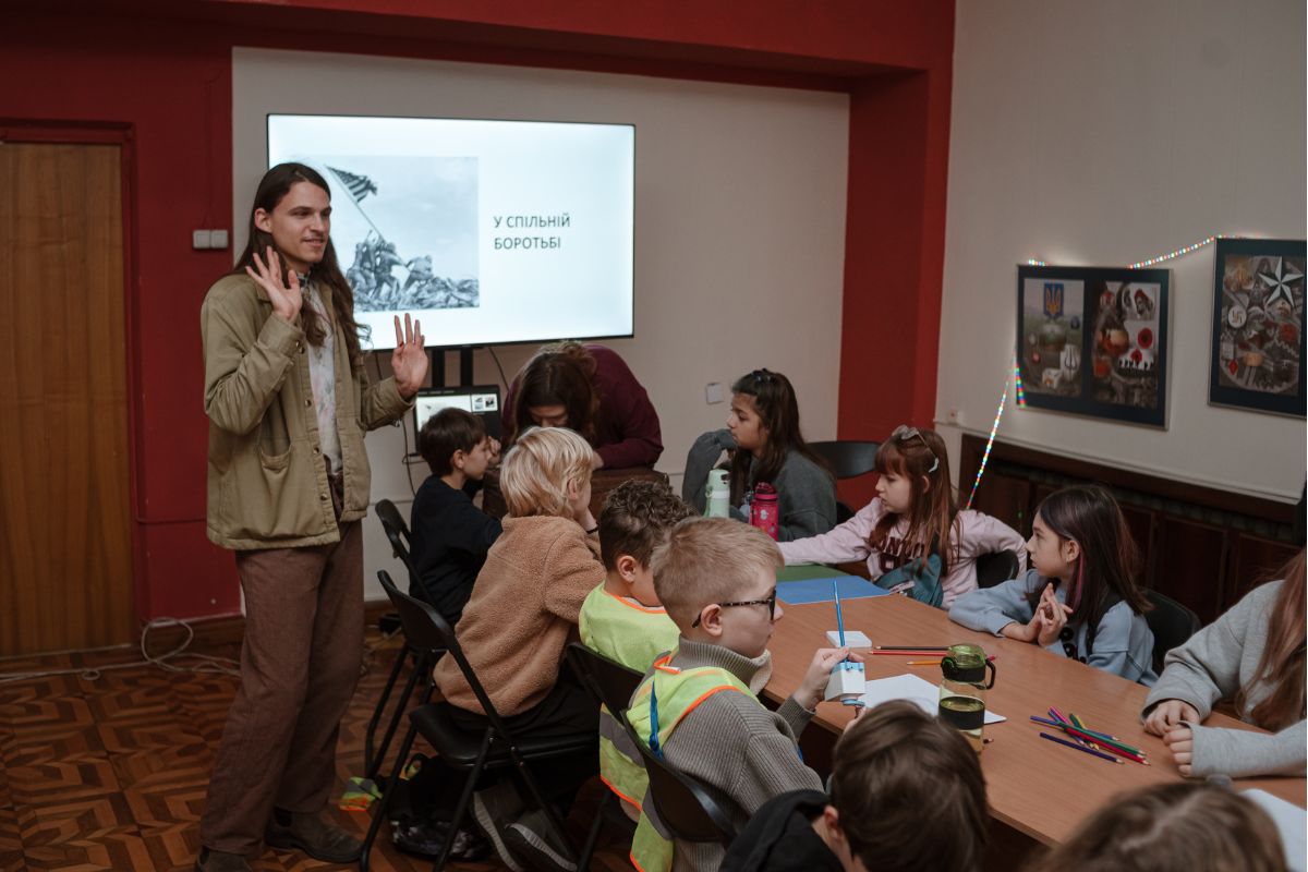 The students were inspired to choose the theme and plot for their animated video by a story told by our guide, Alla Hrushetska. She introduced the children to the stories of foreign fighters who joined the defense of Ukraine—the heroes of the exhibition “FOR FREEDOM”. Among them was the American of Ukrainian descent, Edward Wilton III, who gave his life fighting for Ukraine in 2023.