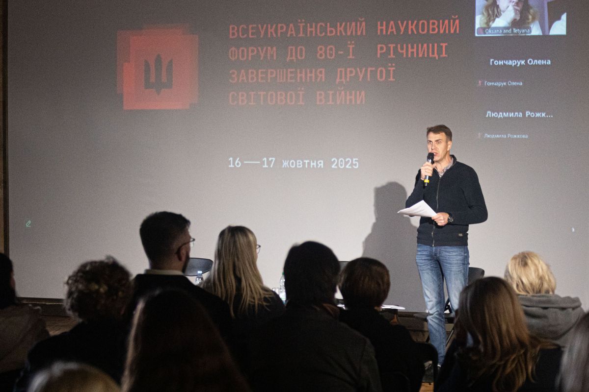 Yurii Savchuk participated in the first panel discussion of the forum, presenting the experience of rethinking the history of the Second World War through the museum’s research, exhibition, publishing, educational, and international activities. In particular, he referenced the exhibition “Our Victory,” implemented in 2025. One of the conceptual notions used by the museum team in this project was the definition “defeated victors,” which simultaneously reflects both the heroism and the tragedy of the Ukrainian experience in the Second World War.