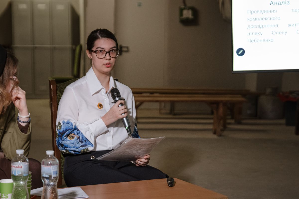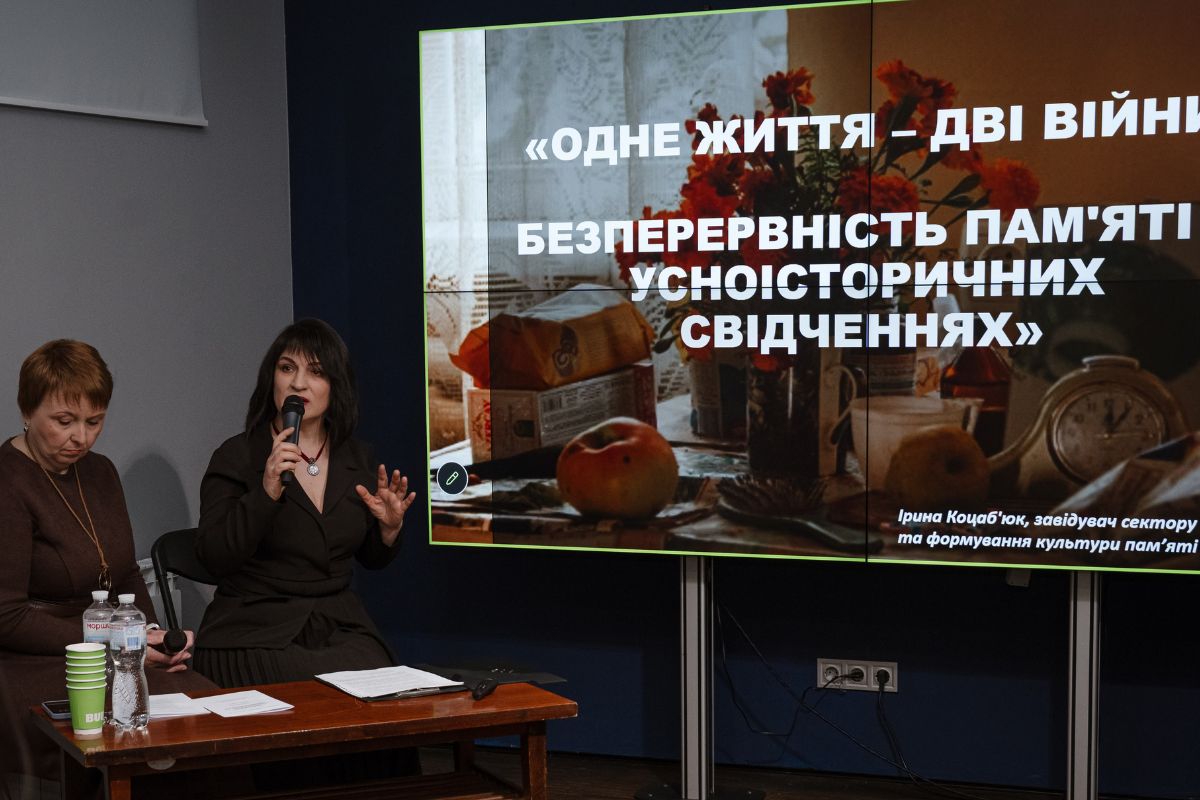 Науковиця Музею Ірина Коцаб’юк виступила з доповіддю про цінність усноісторичних свідчень як важливого ланцюга збереження пам’яті між поколіннями. Зокрема, вона представила проєкт «Одне життя – дві війни», присвячений історіям українців – свідків Другої світової та російсько-української війн.