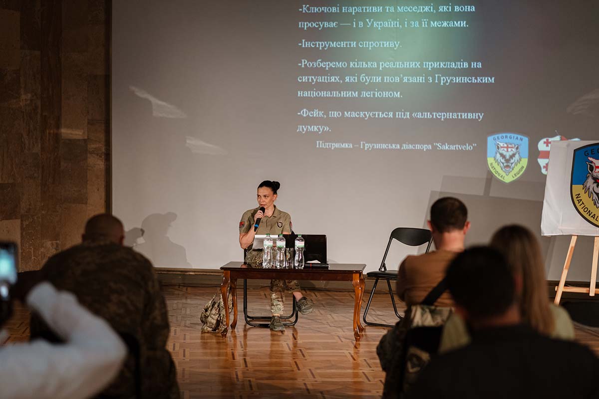 The War Museum hosted a lecture-discussion on information security and countering Russian propaganda. The speaker of the event was journalist Alya Goldmeikhier, author of a documentary about the Georgian Legion and head of its press service. In her presentation, she outlined the main instruments of Russian propaganda: state television channels, a network of controlled Telegram channels, troll factories, and bot farms. She emphasized that propaganda is not a chaotic flow of messages but a centralized system whose goal is not only to justify aggression but also to reshape the worldview of its audience. “Propaganda does not simply transmit messages — it creates notions of ‘one people,’ a ‘defensive war,’ or the ‘futility of resistance.’ Its task is to demoralize, divide society, and delegitimize Ukrainian identity,” Alya Goldmeikhier stressed.
