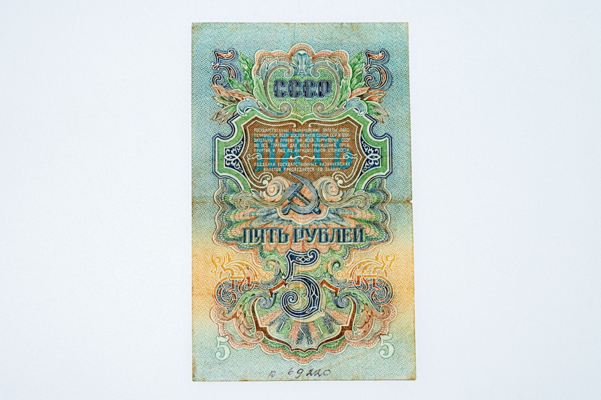 The 5-ruble State Treasury Note of the USSR, issued in 1947, is rectangular in shape, vertically oriented, and printed on watermarked paper. The color scheme is predominantly blue and orange, with the addition of black, blue, light green, and brown-gray tones. The obverse features a decorative rosette with the 1946 version of the State Emblem of the USSR in the center. Above it is an inscription in Russian: “Государственный казначейский билет СССР” (State Treasury Note of the USSR). The denomination is indicated numerically and in words in Russian, Ukrainian, Belarusian, Azerbaijani, Georgian, Armenian, Turkmen, Uzbek, Tajik, Kazakh, Kyrgyz, Karelian, Moldovan, Lithuanian, Latvian, and Estonian. A six-digit serial number with a two-letter prefix (e.g., тР 929636) and the issue year, 1947, are printed at the top and bottom.
