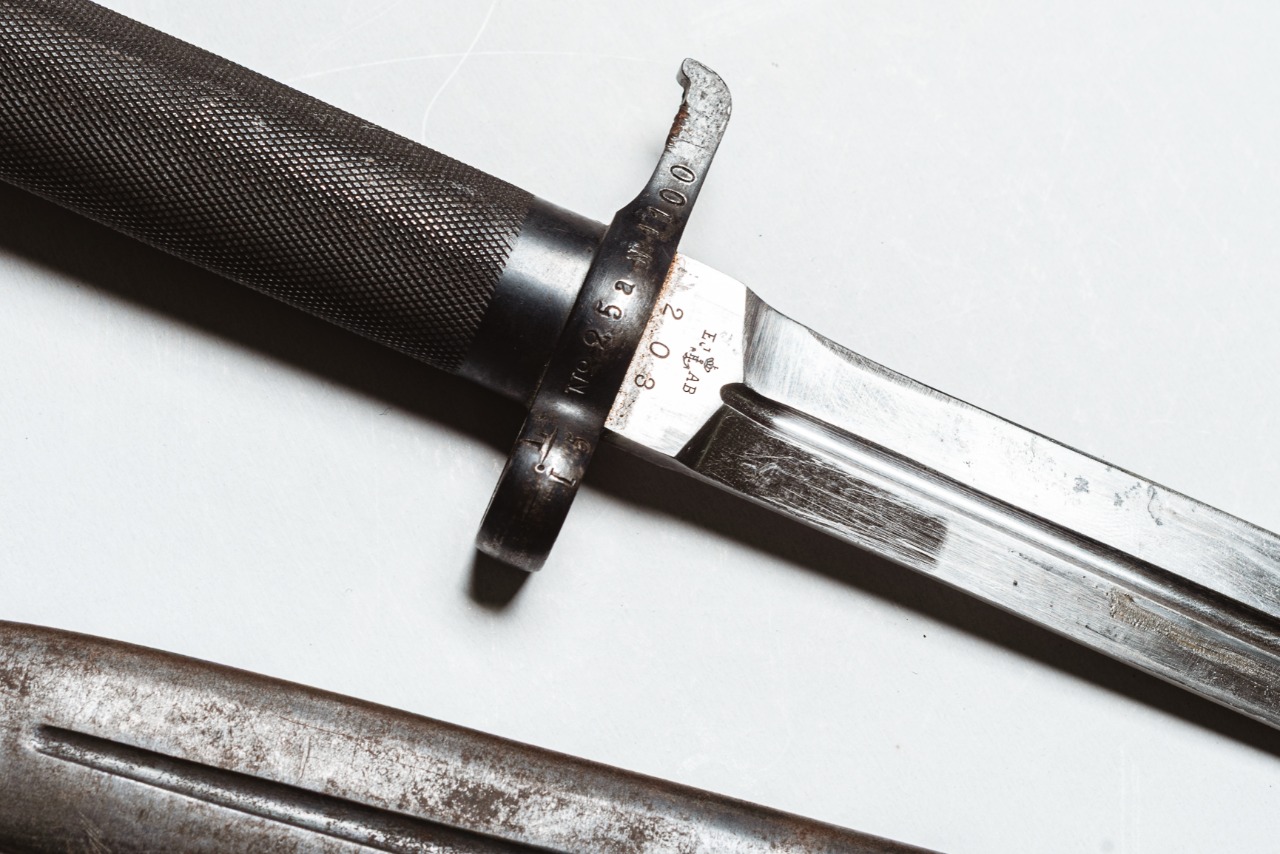 Notably, this specimen consists of parts manufactured in different periods and workshops: the hilt dates to 1905–1913 (with its characteristic conical socket), the blade has three-digit numbering, while the scabbard — judging by the finial’s shape — derives from an older model. The execution of the maker’s mark differs slightly from originals, suggesting later modifications or re-stamping of the blade.