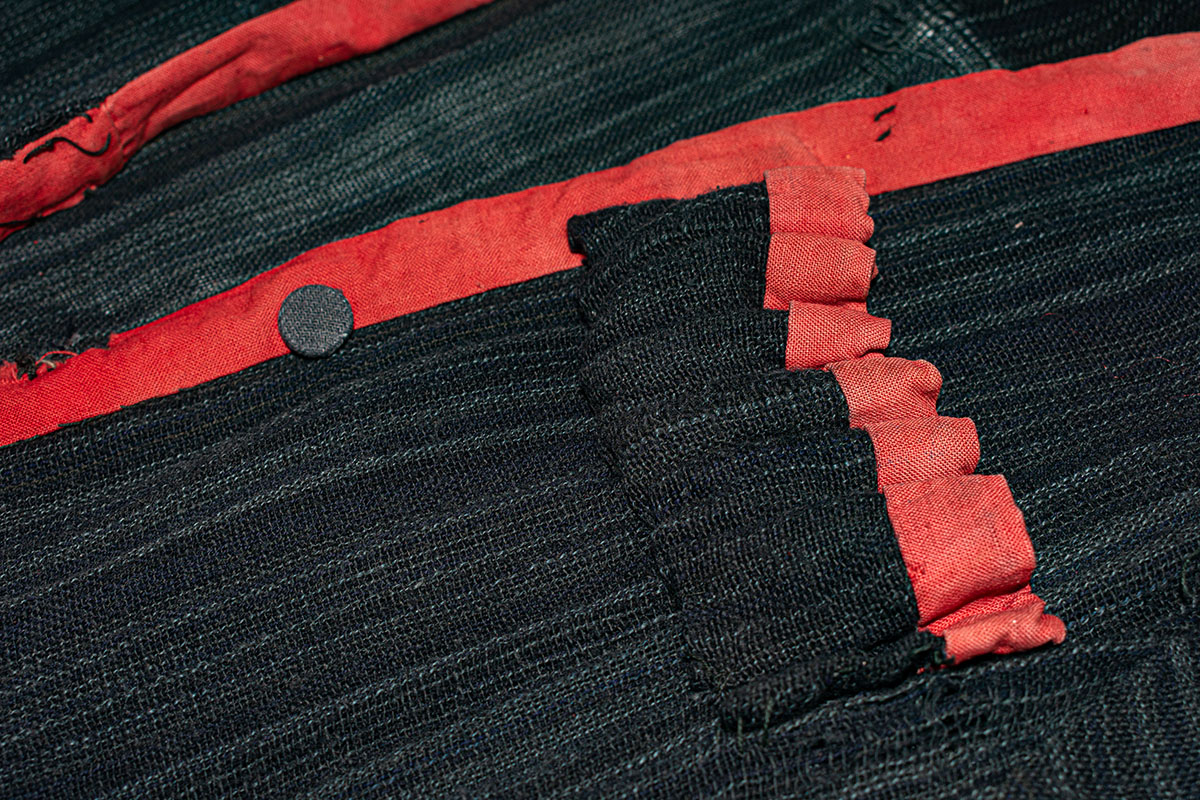 he costume is made in the style of a chokha—a traditional outer garment worn by men in the Caucasus region. It is sewn from gauze dyed black. The garment is slightly fitted at the waist and flares at the bottom, with long sleeves and no collar. On the upper chest area, red fabric gazyrs are sewn on both sides, each designed to hold eight cartridges. All edges of the costume are trimmed with red fabric. It fastens with two black fabric-covered plastic buttons.