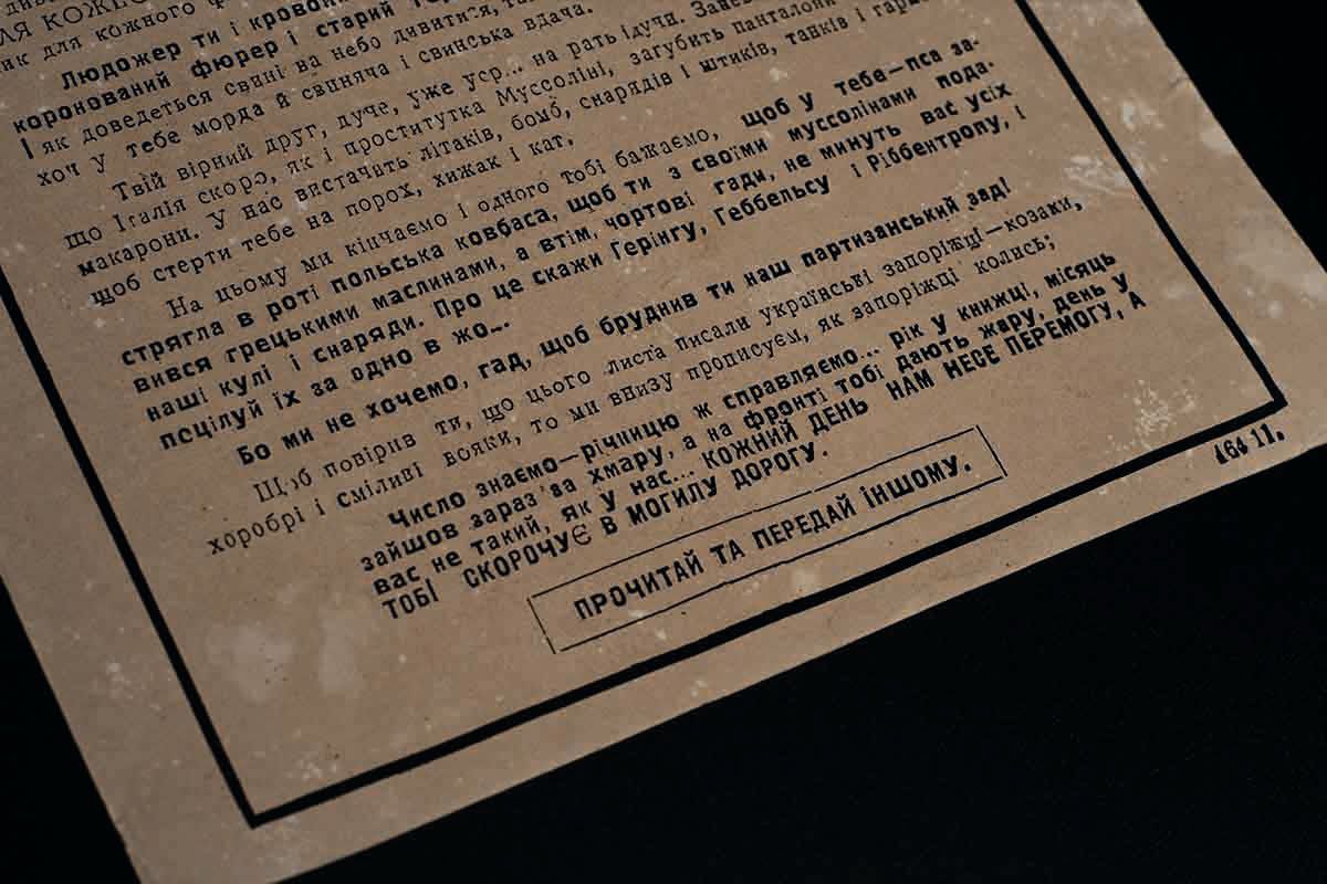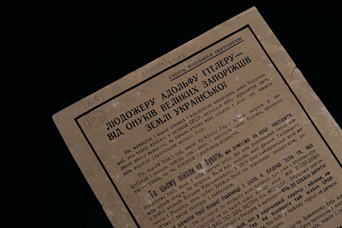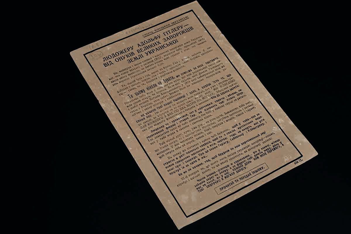 During the Second World War, the Soviet propaganda machine often exploited national identity, local histories, and cultural features of peoples to strengthen the morale of the troops. Such sources were therefore found in the museum’s collection and presented to visitors. One such example is a postcard that appeared in 1941, when Soviet forces, pressed by the Nazis, were retreating in defensive battles. Just as the Cossacks once wrote their mocking letter to the Turkish Sultan, so now their descendants wrote to a new tyrant — the cannibal Hitler.