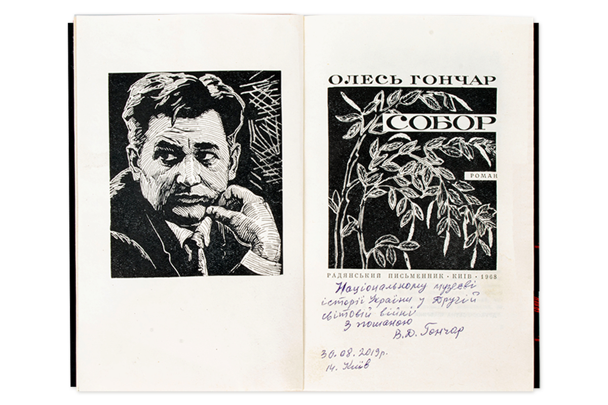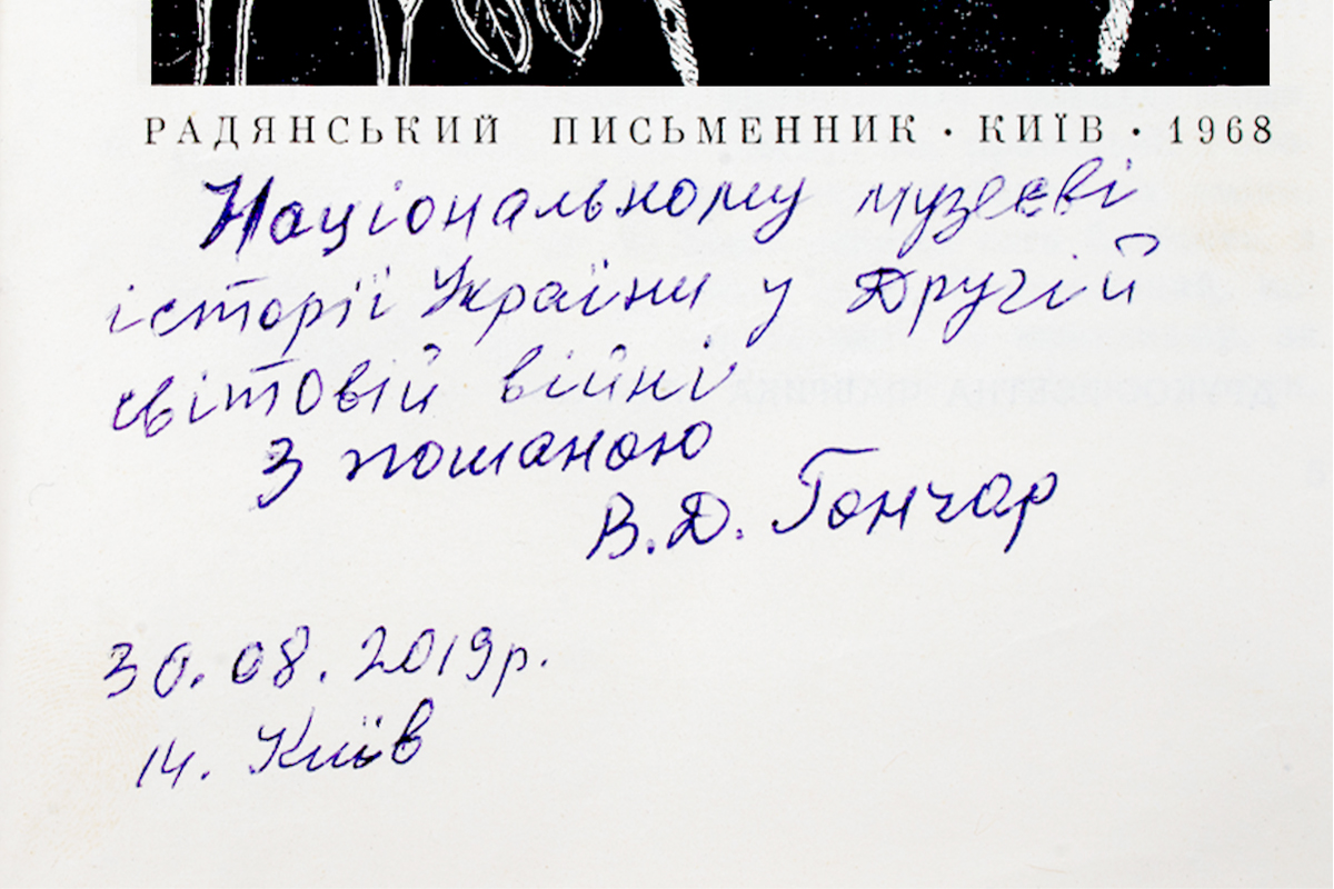 In the Museum exhibition space presented a notebook with manuscripts of poems of famous Ukrainian author and public activist, board member of the Union of Writers of the UkSSR, recipient of a number of prizes, Hero of Ukraine Oles (Olexander) Honchar. A poem “To Ukraine”, written in 1941 is on pages of this notebook. This unique relic with author`s correction of a row “does not frighten me Siberia” along with other items of written authenticity became able to exhibit after Ukraine gained its independence. This artifact at first was presented in 1994, after fundamental (for those times) re-exhibition.