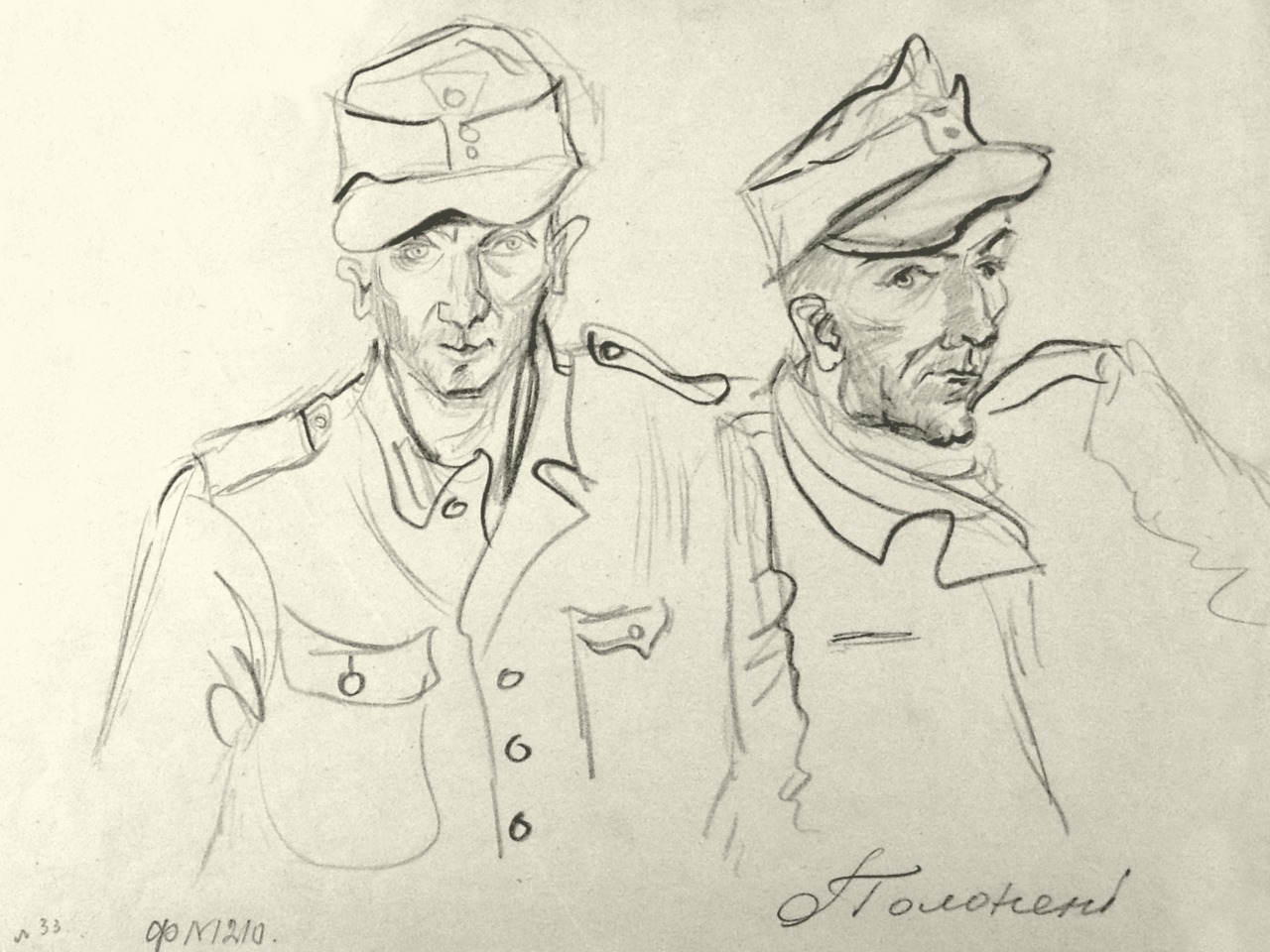 Although the team had been instructed on which figures to document, Yenina sketched everything she encountered along the way – ruined Ukrainian villages, displaced people left without homes, a girl named Mariyka from the village of Lopatynn (now Lopatyn urban-type settlement, Lviv region), who greeted tank crews and gifted them an embroidered kerchief, captured German soldiers, and more. She also created a series of drawings in a military hospital. These included portraits of Hero of the Soviet Union A. Sulyma, Order of Glory 3rd Class recipient I. Antonov, and other Red Army soldiers from the 1st Tank Army. Some works contain no commentary, while others feature detailed captions. On the portrait of a tank driver-mechanic, for example, she wrote: “Guardsman tanker A.A. Shyrokov. Wounded five times, 18 of his tanks burned in battles.”