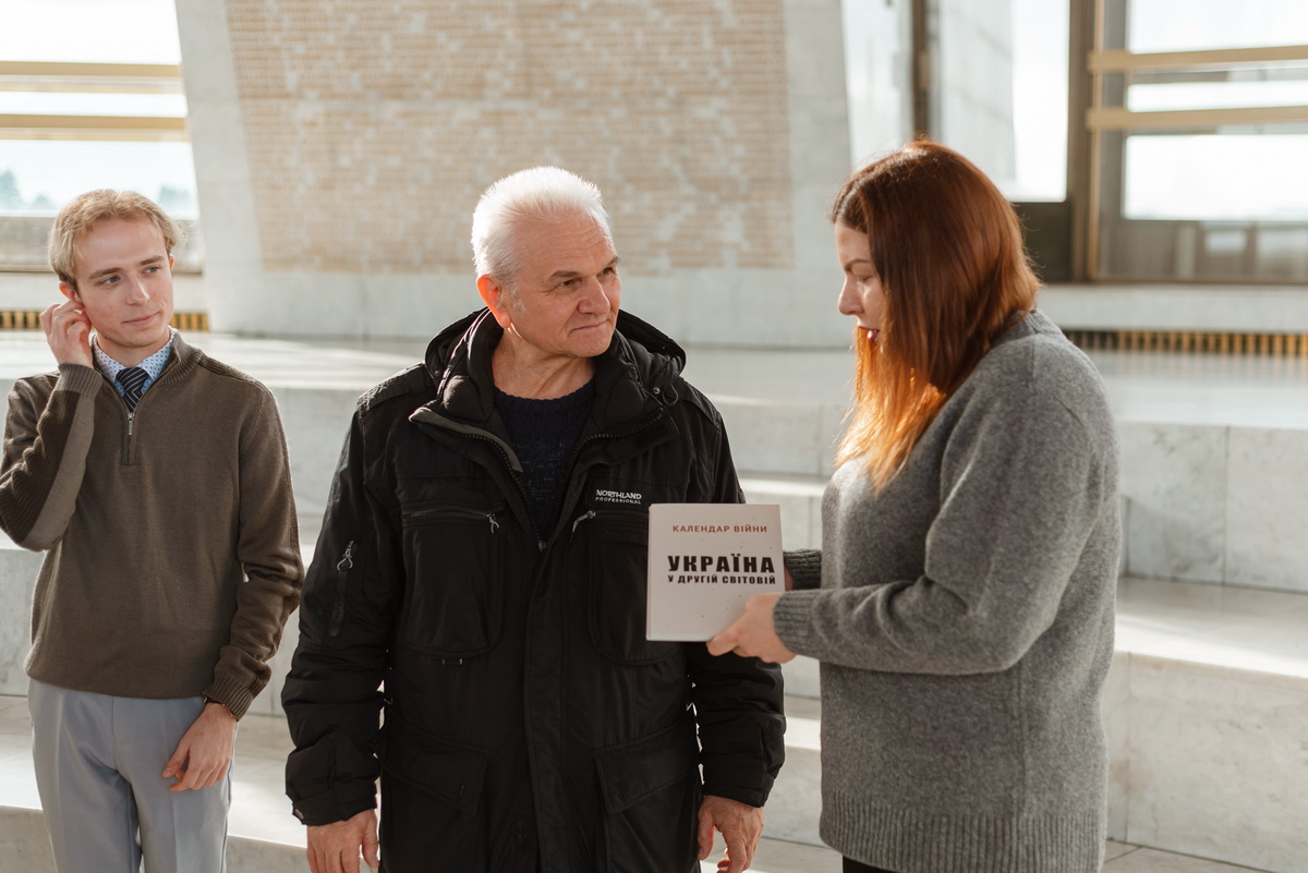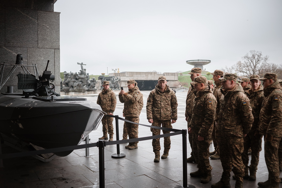 Museum guides Alla Hrushetska, Ihor Buchma, Ruslan Bolobon, and Oleh Prelovskyi introduced the cadets to exhibitions on the Second World War and the current russian–Ukrainian war, as well as to displays of military equipment and weaponry. This year, particular interest was sparked by new exhibits – naval drones of the “Magura” and “Sea Baby families”. The cadets were able to explore the evolution of military technologies from the first half of the 20th century to the present day. To deepen their historical knowledge, a copy of the museum publication “Ukraine in the Second World War. The War Calendar” was presented; this year it received the approval mark of the Ukrainian Institute of Education Development under the Ministry of Education and Science of Ukraine: “Approved for Use in the Educational Process.”