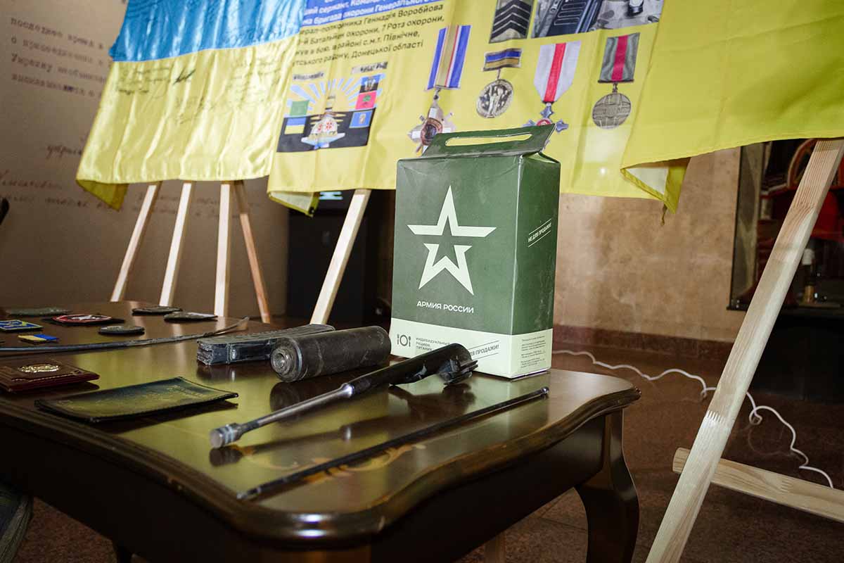 During the event, the defender solemnly transferred to the Museum’s collection wartime artifacts – blood-soaked personal belongings, shoulder insignia, and brigade flags, as well as trophies captured from the enemy. The story of one flag especially moved the audience. On the blue-and-yellow cloth was depicted Ihor’s friend and mentor – squad commander of the 101st Guard Brigade of General Staff, Senior Sergeant Volodymyr Bondarenko. The defender was killed in battle on November 29, 2023, but forever remained in the hearts of his comrades.