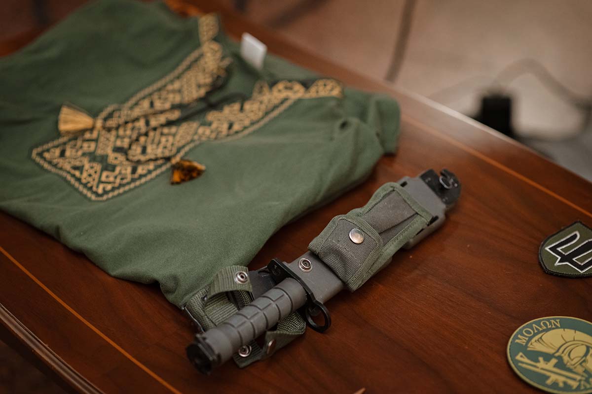 The soldier also donated artifacts to the Museum’s collection. Among the exhibits are an embroidered vyshyvanka-amulet, a captured russian bayonet, shell casings and bullets from battle sites, and shoulder patches.