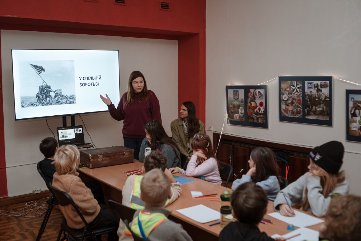 The students were inspired to choose the theme and plot for their animated video by a story told by our guide, Alla Hrushetska. She introduced the children to the stories of foreign fighters who joined the defense of Ukraine—the heroes of the exhibition “FOR FREEDOM”. Among them was the American of Ukrainian descent, Edward Wilton III, who gave his life fighting for Ukraine in 2023.