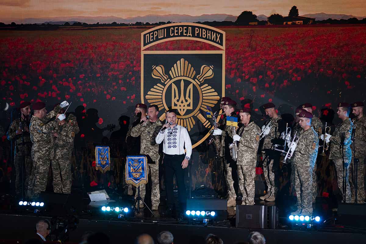 Performers included The National Exemplary Band of the Armed Forces of Ukraine, Band of the Kyiv Presidential Honor Guard Battalion, the Academic Song and Dance Ensemble of the National Guard of Ukraine, Sofiia Nersesian, Ptashkin, Artem Loik, Bak$, “Garda” Band, Bah.roma, Vlad Bulakh and Valeriia Okhtyrchanka. They performed their own compositions written during the war, as well as famous rifle songs from the times of the Ukrainian War of Independence and the Ukrainian Insurgent Army (UPA). The evening was hosted by Ukrainian actor and serviceman Harik Bircha.