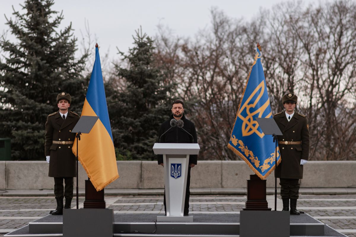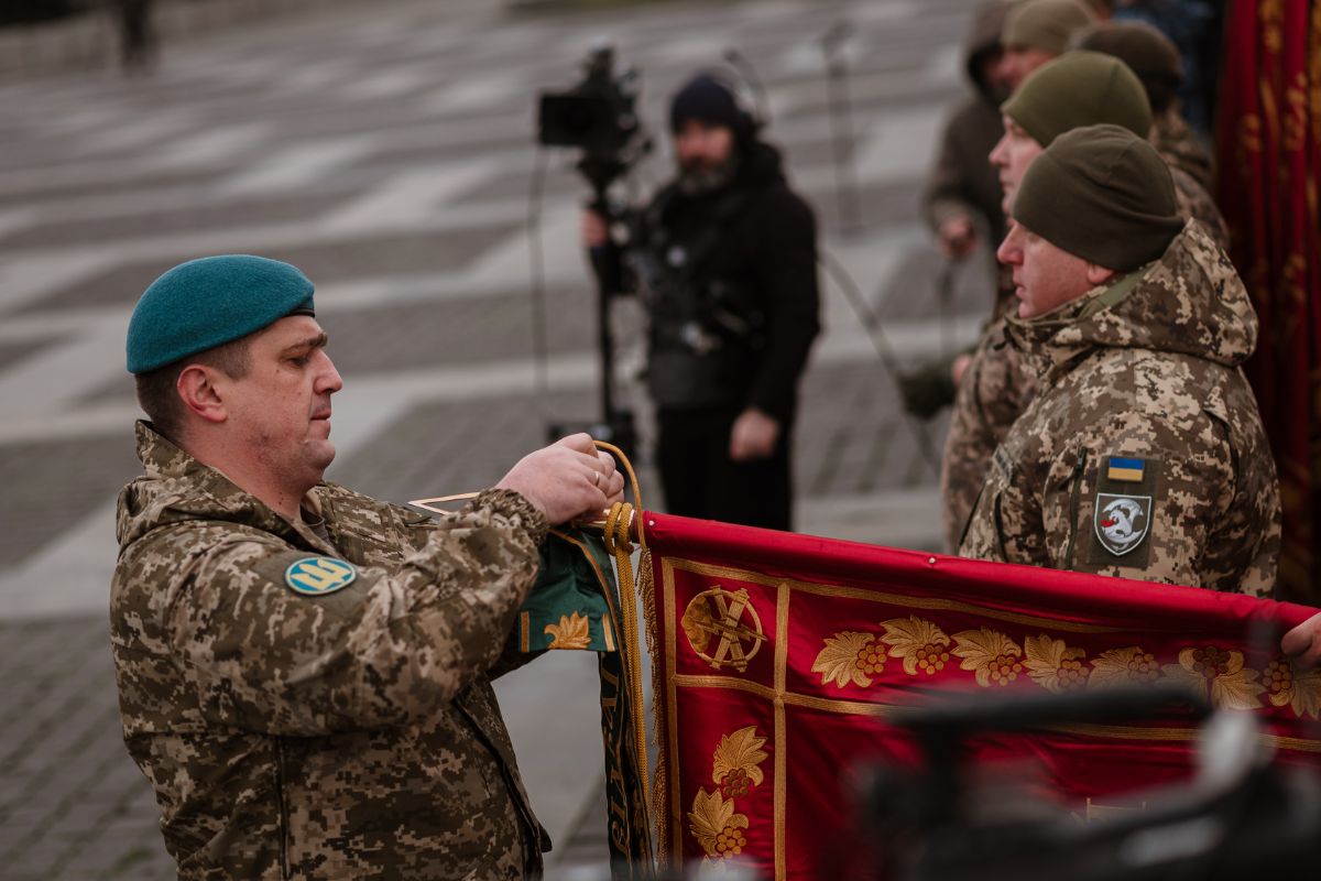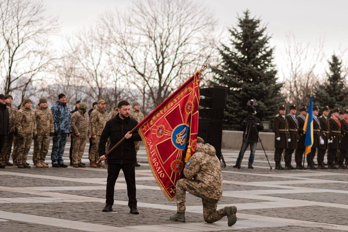 Очільник держави вручив бойові прапори командирам 141-ї окремої механізованої бригади, 414-ї окремої бригади безпілотних систем «Птахи Мадяра», 425-го окремого штурмового полку «Скеля» та 108-го окремого штурмового батальйону «Вовки Да Вінчі» 59-ї окремої штурмової бригади безпілотних систем імені Якова Гандзюка. А командиру 42-ї окремої механізованої бригади вручив стрічку з її найменуванням на честь Героя України Валерія Гудзя.