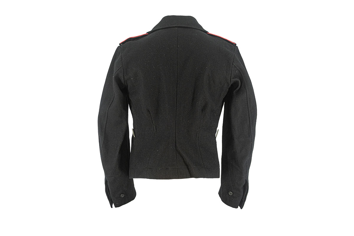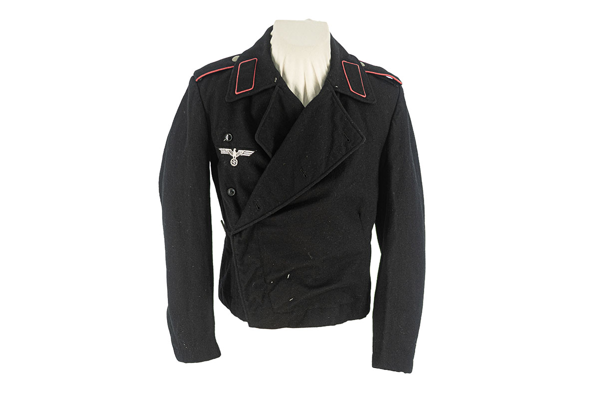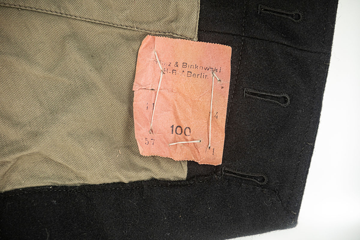 The jacket features a short, double-breasted style fastening with internal and external buttons. The collar has sewn-on collar tabs (Litzen) without the skull emblem (Totenkopf), featuring rose-pink piping that designated the armored troops (Panzertruppe). On the right breast there is an embroidered emblem—an eagle (Parteiadler) with outstretched wings, its head turned to the left (the party emblem used until 1936). The inner lining is made of grey-olive fabric and includes internal pockets. The belt loops are preserved. This style ensured the jacket fit tightly to the body without unnecessary details that could snag on equipment within the cramped space of a tank. The black color was also chosen intentionally: it effectively concealed traces of fuel, lubricants, dust, and dirt.