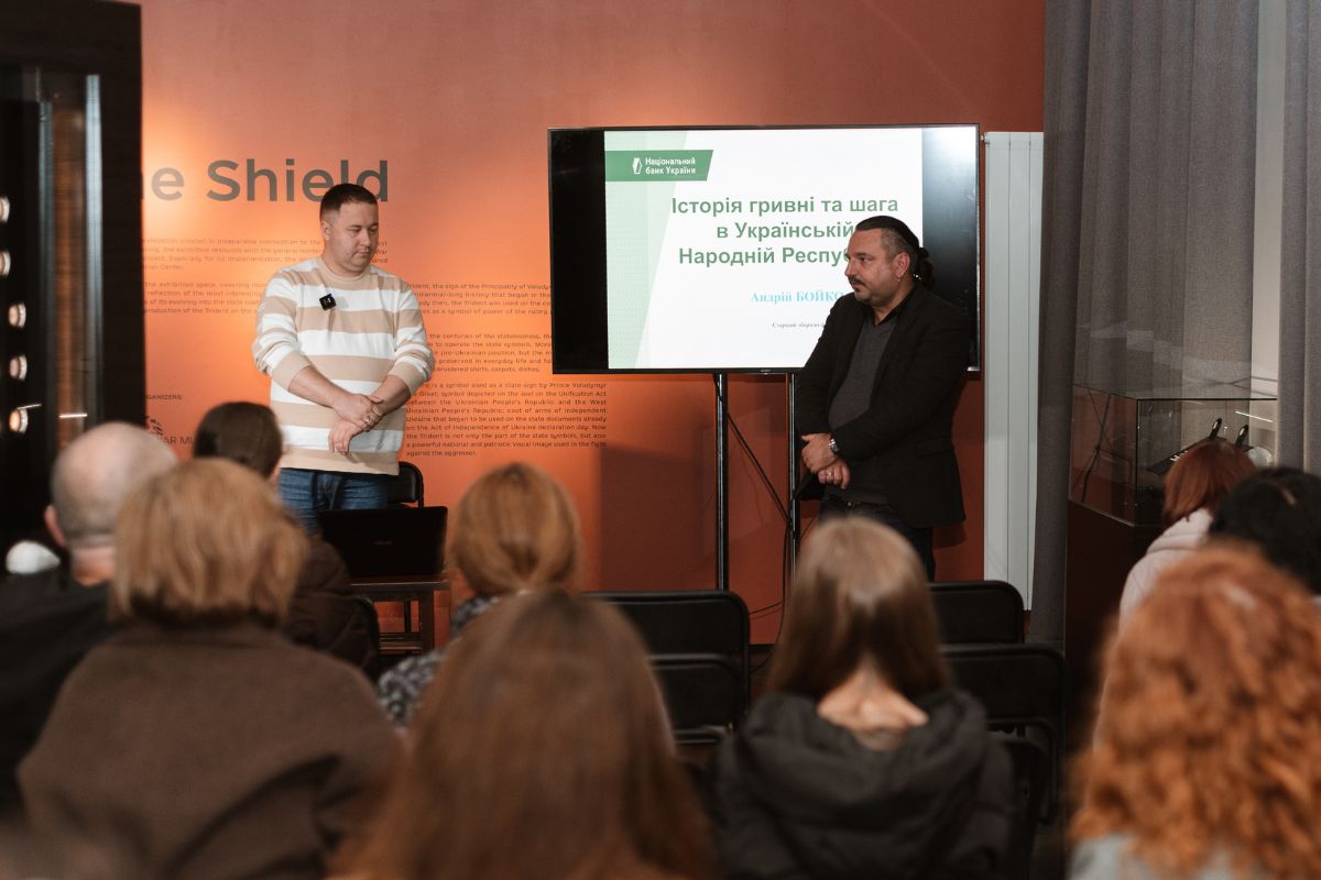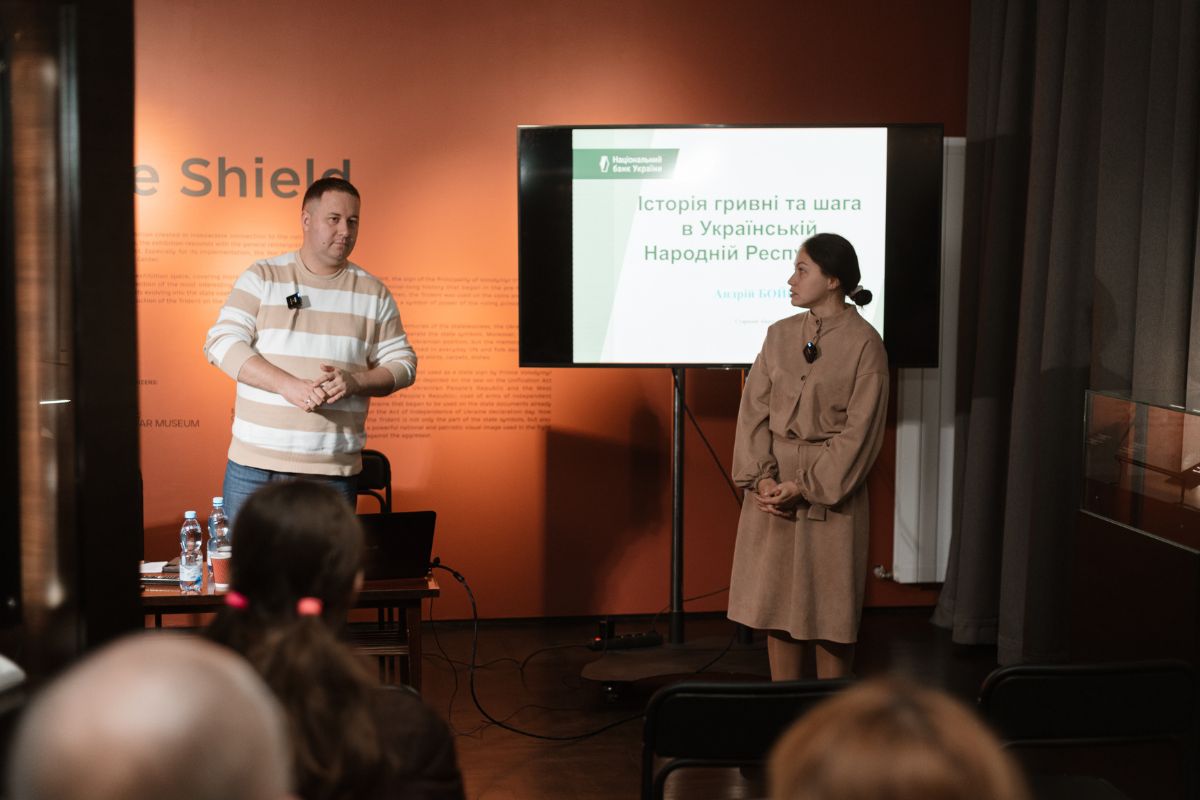 Renowned numismatist, Doctor of Historical Sciences, and Senior Curator of the “Money Museum” Department of the Communications Directorate of the National Bank of Ukraine, Andrii Boiko-Haharin, was the speaker at the lecture-discussion “The History of the Hryvnia and the Shag during the Ukrainian People’s Republic”. The event was moderated by Olena Datsiuk, a researcher at the Museum.