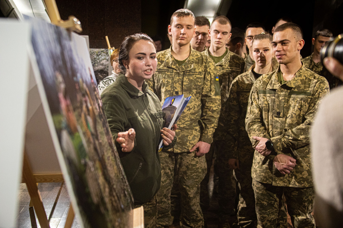Авторка ідеї виставки, начальник відділення комунікацій бригади лейтенант Анастасія Шевченко, провела екскурсію для гостей. Вона детально розповіла про моменти, зафіксовані на фотографіях, акцентуючи увагу на символах єдності та сили духу українських воїнів. А про один із найвражаючих експонатів виставки – фотографії бойової роботи танкових екіпажів – розповів безпосередній учасник подій, механік танка «Леопард». Своїми рефлексіями та досвідом поділився також Захисник із позивним «Джоконда».